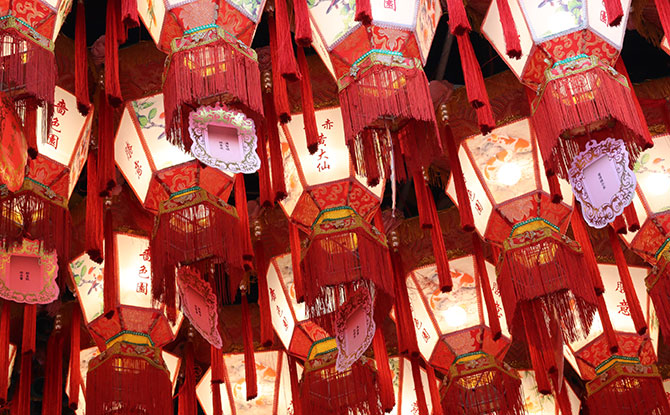 Eat mooncakes light lanterns guess lantern riddles